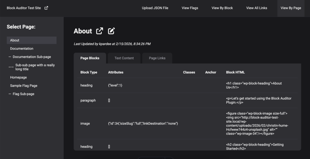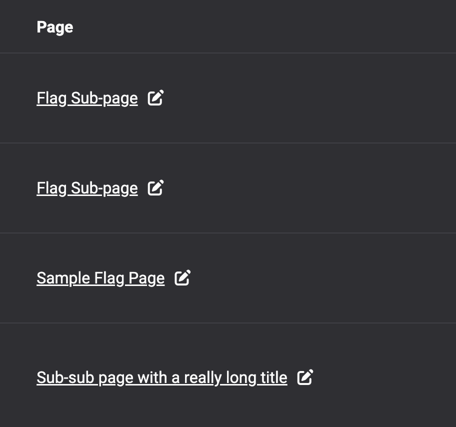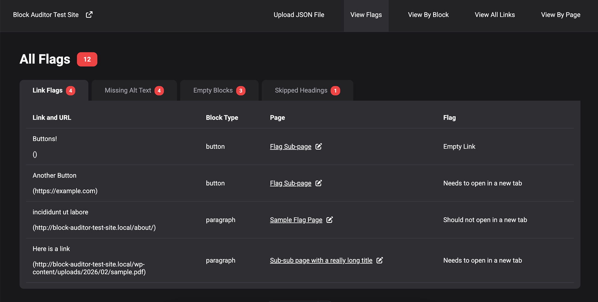 I conveniently added links to both the published page and the editor for that page for each flag and block so that if the user discovers an issue, they can quickly enter the editor or view the issue.